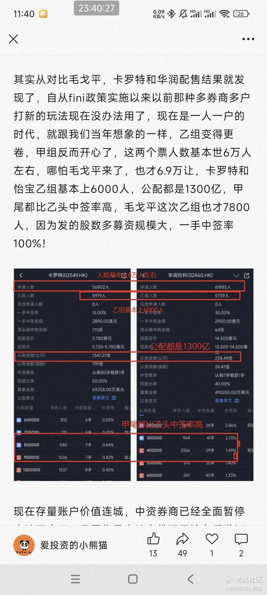 126841人参与认购,其中甲组98721人参与认购,中签20101人;乙组28120人参与认购,中签20100人,总共只有40201人中签,顶头槌认购才中签1手,乙组也参与抽签。对于这个人数增长,大家也不用过于担心,听说有这么2~3万人,纯粹是那种以前多户打新牛市的时代存留下来的一手党,当时有一批人专门搞了这一些账户,在某一个券商里2-3万个,打新牛市的时候,一直在弄这个一手党的融资,只是后面行情变差了,他们就没去搞了,现在行情好了了,这些逐利的一手党又回来了,