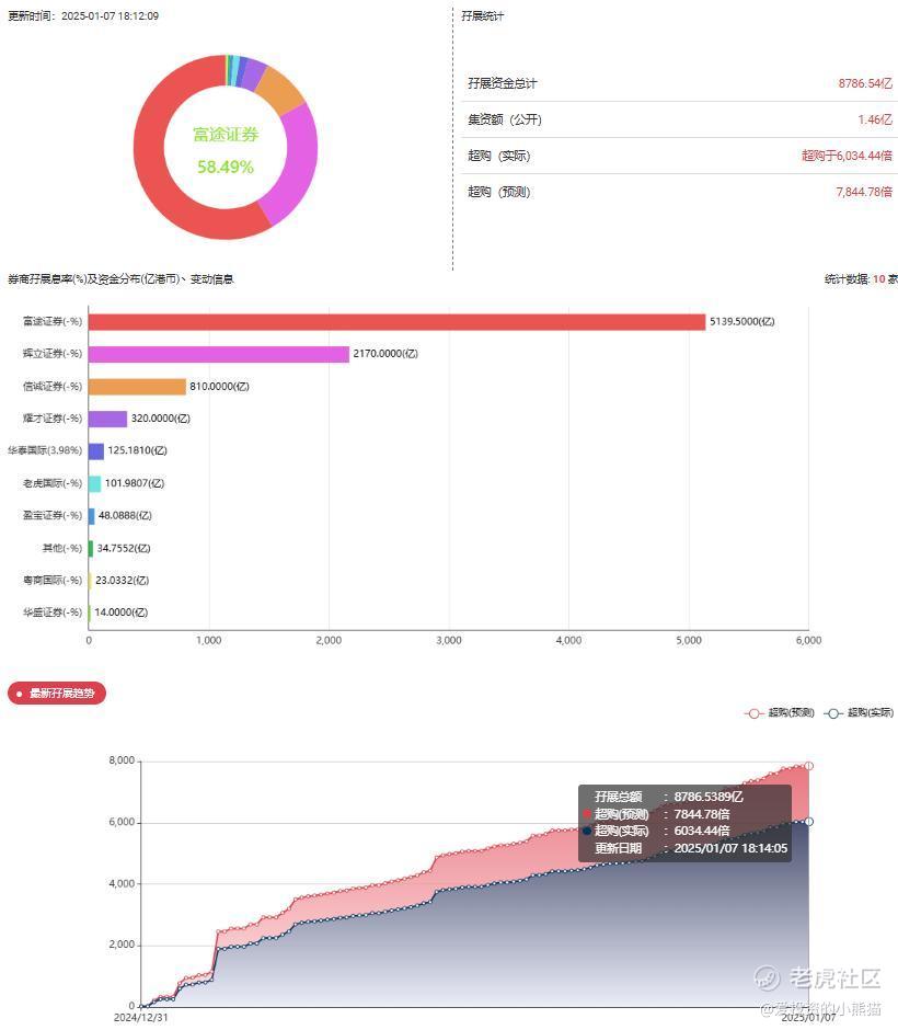交易宝上统计孖展资金为8786.54亿,超购6034.44倍,而实际有5999.96倍,基本上也是6000倍,其实这个数据是有点奇怪的,毕竟交易把统计的也不是所有的券商,像银行系以及招商系,这些都没有算进去,这些全部算进去了,至少6500倍是有的,那为什么最后只剩下6034倍呢?大概率是一些苏醒过来的老账户,多券商多账户重复认购了,重复认购之后交易宝那边是统计了,但实际上单子被港交所给拒绝了,重复认购会导致两个券商或者多个券商同时不中签,那这次损失就大了,但这也是给这些人的一次教训了,没有关注市场,直到市场行情好的时候才回来,那肯定在刚回来的时候一定是要挨刀子的。