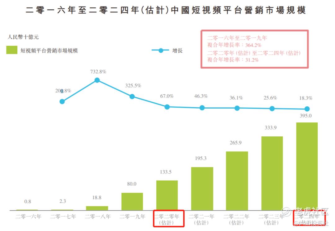 根据第三方数据,2020-2024年短视频平台营销市场规模将从1335亿增长到3950亿,复合年增长率为31.2%。