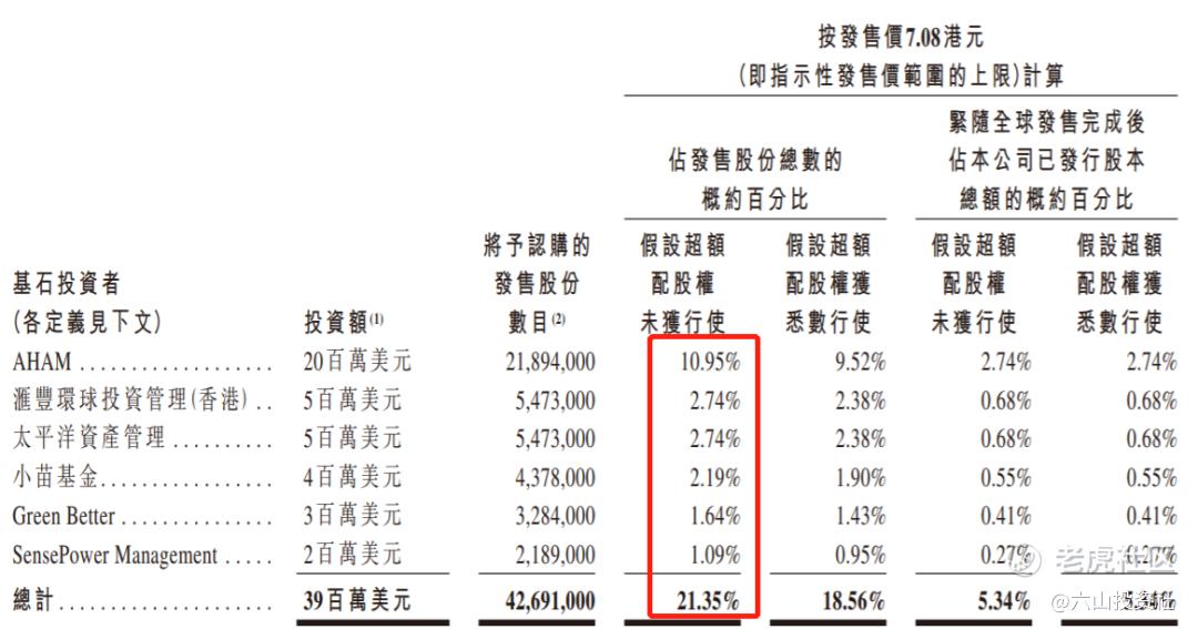 6名基石投资者认购了约21.35%-27.18%的股份。