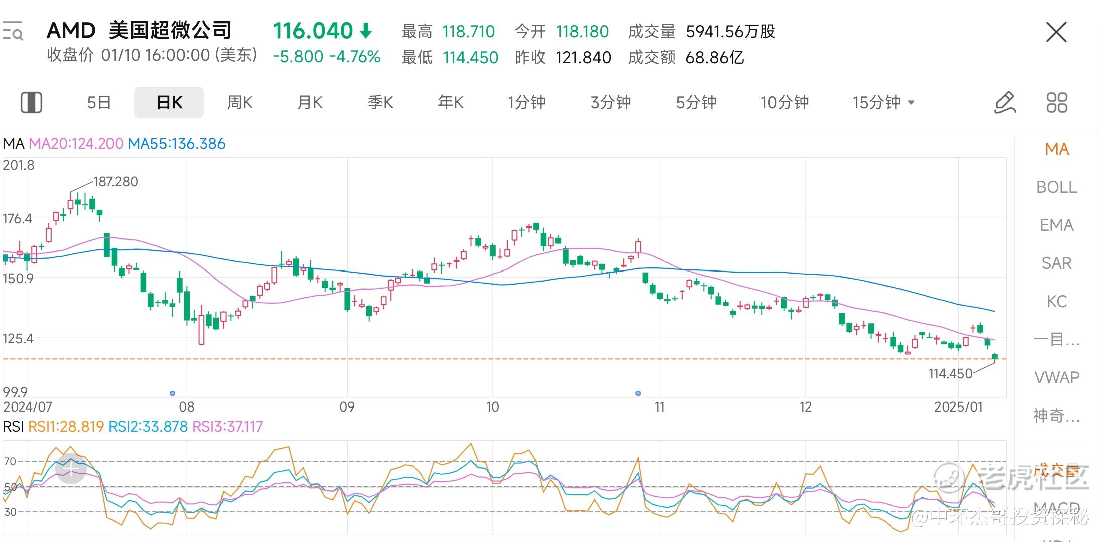 AMD,屋漏偏逢连夜雨,让本来弱势的中长期走势,更加羸弱不堪,直接创出了一年多的新低,对于AMD,这是一只长线股,我们不是关注的短期走势,我们应该多很看周线和月线,周线已经是两年多的最低指标了,月线已经要受到55月线的有力支撑了。从这些信息看,AMD是要受到技术面和基本面的双重加持,才有可能扭转近一年的下行趋势。