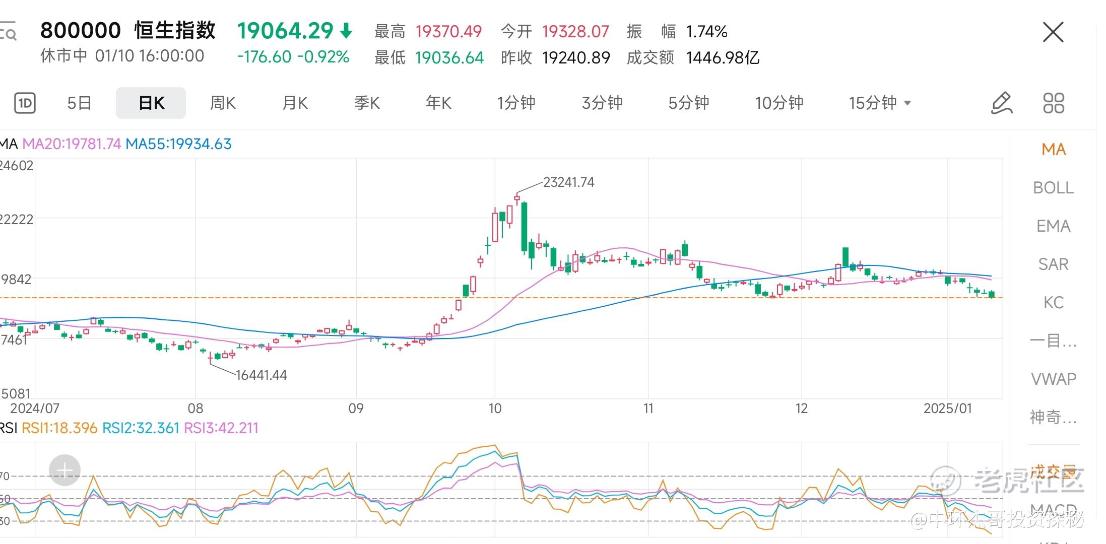 恒生指数,极度超卖,然而这却不是买卖的最重要的标准,即使有了反弹,没有持续性也没有意义。恒生指数夹在中美之间,受到影响的因素较多,1/15的小作文,1/31或者2月初的投行的预期时间点,特朗普政策的明朗化等等,这些才可能是恒生指数中长期的回升因素。恒生指数已经不能。