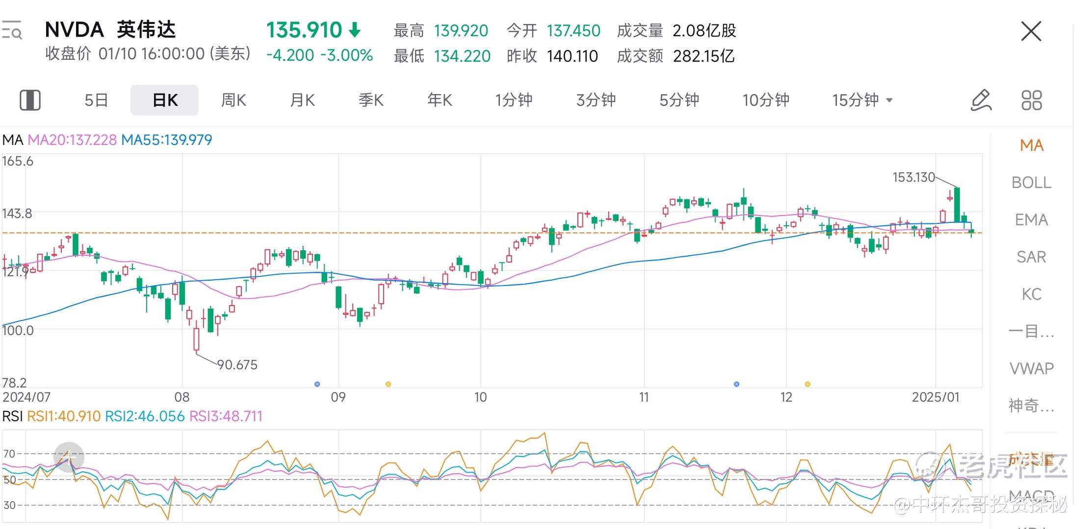 英伟达,刚开始有错杀意味,后面有政策连累的因素,总之,都不是决定性的因素,还是那句话,只要英伟达跌倒15-20%的位置,总是有人疯一样地抢筹,直到英伟达长期炸裂的业绩有明显地放缓。目前英伟达重新进入震荡区间,中长期安全无忧,短期,就看20天线的位置能否就此站稳。