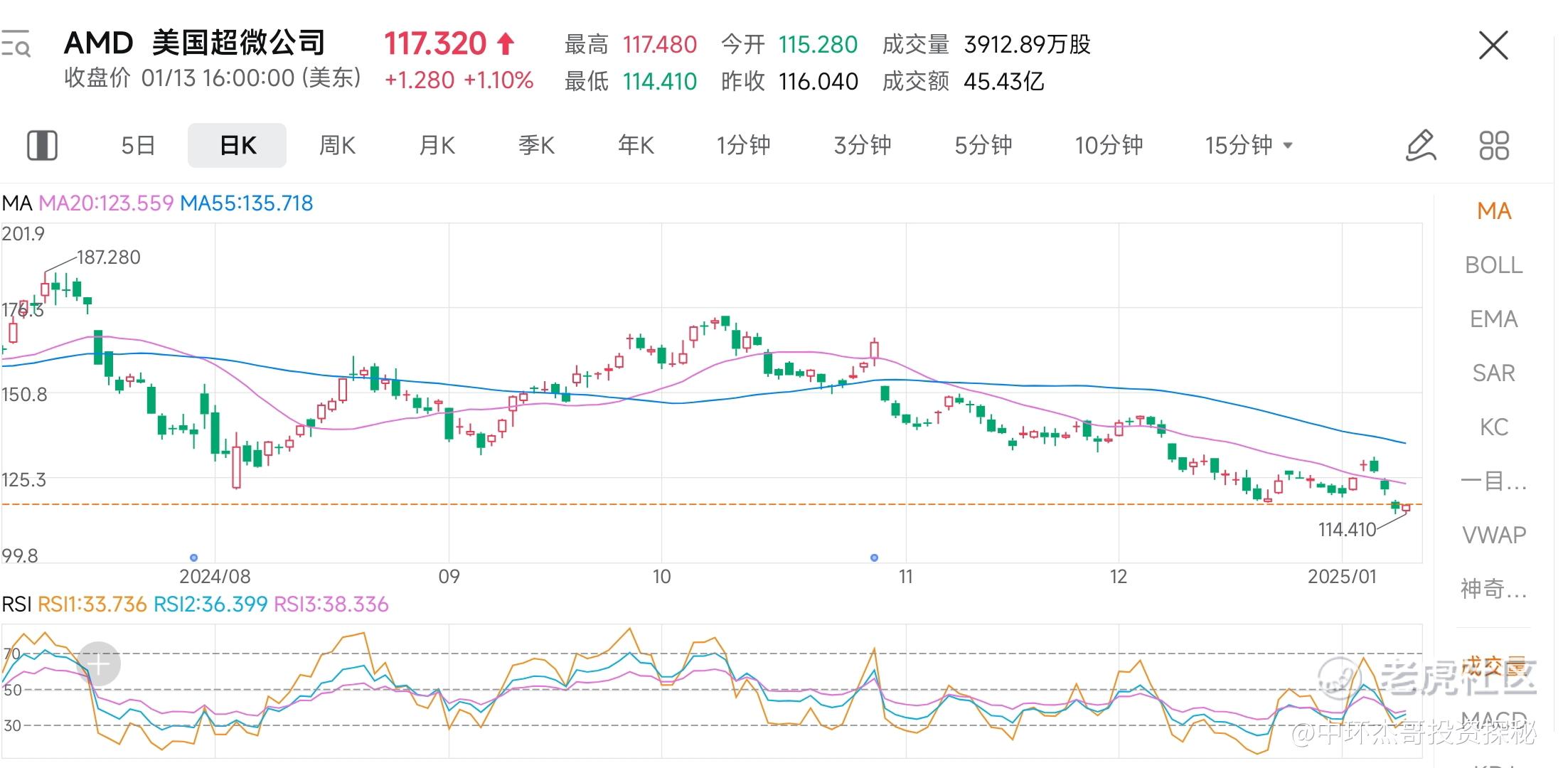 AMD在创出一年新低的局面下,再次创新低,尾盘强势收红,中阳报收,算是,破天荒压英伟达一头,什么时候经常超过英伟达,AMD就王者归来了,尽管她永远是小王。AMD刚刚破新低,离企稳和反弹反转还有不小距离,慢慢跟吧。