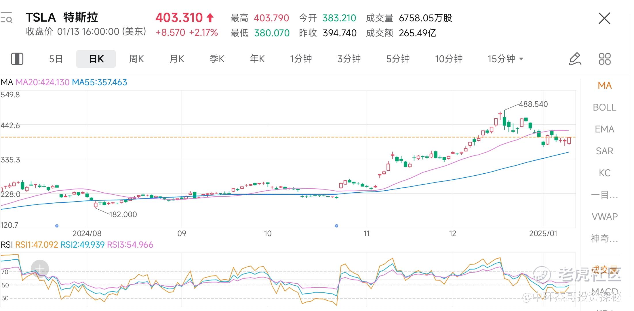 特斯拉,当不少人认为特斯拉将要大跌暴跌,或者展开慢慢调整路的时候,特斯拉走出了自己的特点,前面调整幅度确实大,但是,也不是特别过分,在反弹至20天线后,虽然回落,却不是另外一拨酣畅淋漓的调整,目前,已经缓慢走出三根阳线了。也有望率先企稳。就像投行所言,如果高预期,其可以翻倍,如果低预期,其可以腰斩。。。。。。