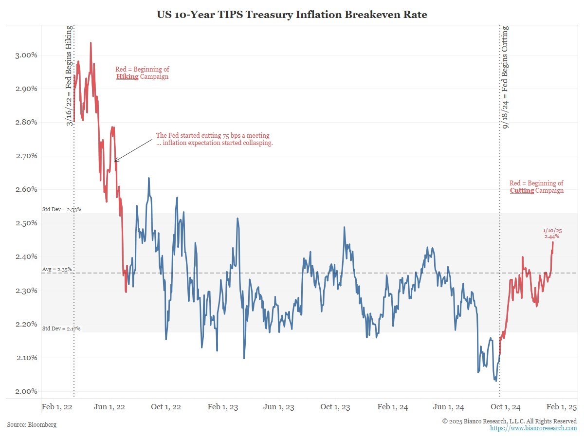 ②从十年期 TIPS通胀保护债券的表现看,市场不再视降息为刺激经济的正面信号,而是担忧降息可能进一步加剧通胀压力,这种情况下,联储不再降息反而会成为利好。1月15日将公布通货膨胀数据,到时候看市场如何表现。