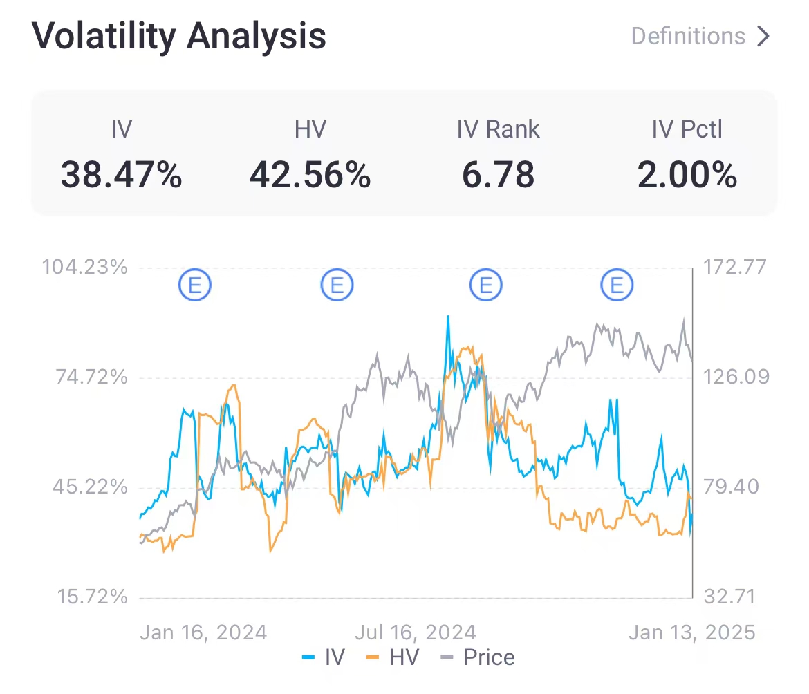 尽管存在上述基本面不确定性,英伟达的隐含波动率(IV)目前为 38.47%,处于相对较低水平。因此,投资者可以通过低成本的方式对冲头寸,或者以有限资金敞口参与市场机会。