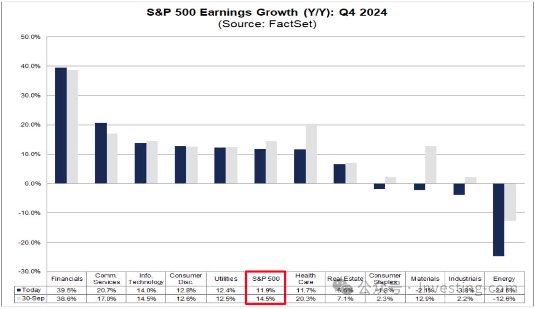 据FactSet估计,与去年同期相比,标准普尔500指数成分股第四季度每股收益预计将增长11.9%。这一增长率略低于9月30日预测的14.5%的年度盈利增长。