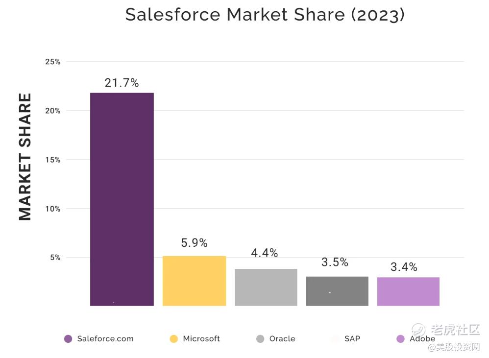 2023年,CRM以21.7%的市场份额稳居全球CRM市场第一,远超微软和甲骨文。这种长期的行业领导地位得益于其持续的技术升级和对企业需求的深刻洞察,为其打下了稳固的市场基础和收入来源。