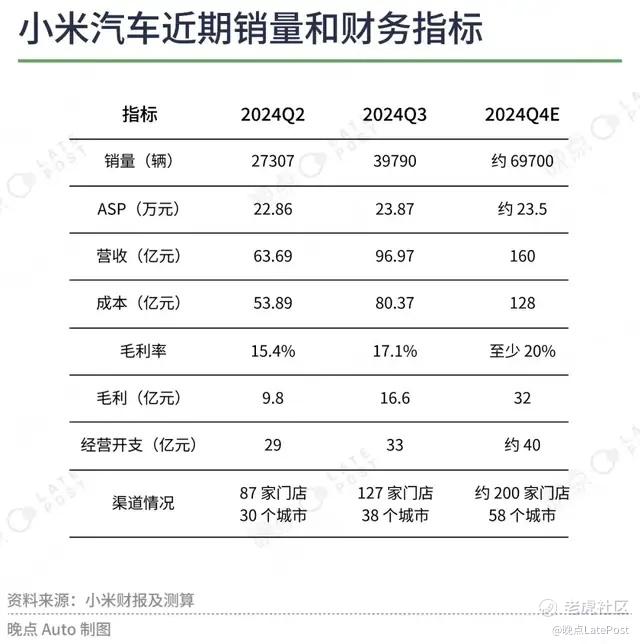 根据公开数据可以大致确定,2024Q4 小米一期工厂的产能利用率在 186% 的水平,个人预计,这个季度其 ASP(车辆平均售价)大概在 23.5 万元,毛利率将提升到至少 20% 的水平,经营开支大概在 40 亿元左右。