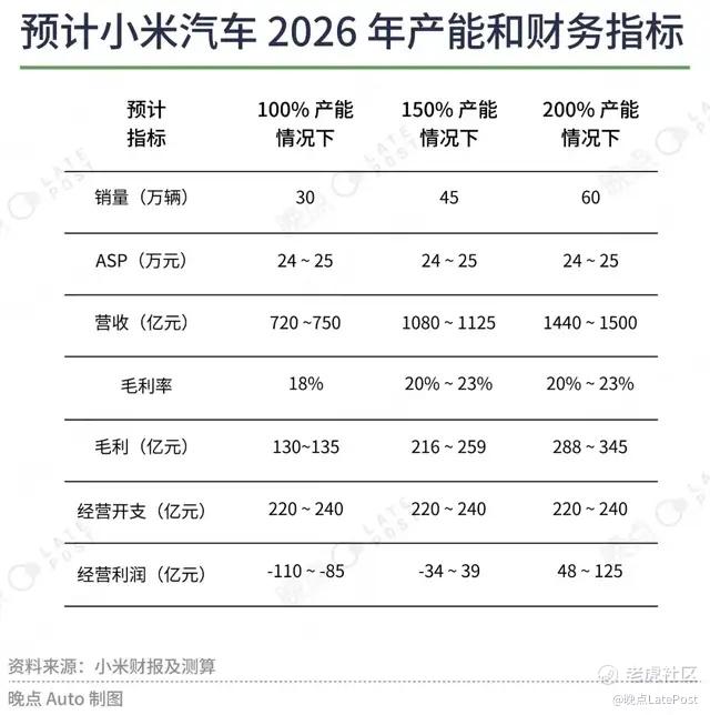 在此基础之上,我们可以再进一步推测 2026 年小米汽车可能面临的财务情况,还是按照需大于求的市场理想情况,2026 年 SU7 和 YU7 都将拥有 15 万辆的年产能,预计该年小米汽车整体 ASP 可能还是介于 24 万元~25 万元区间,且经营开支也将实现 10%~20% 的增长。