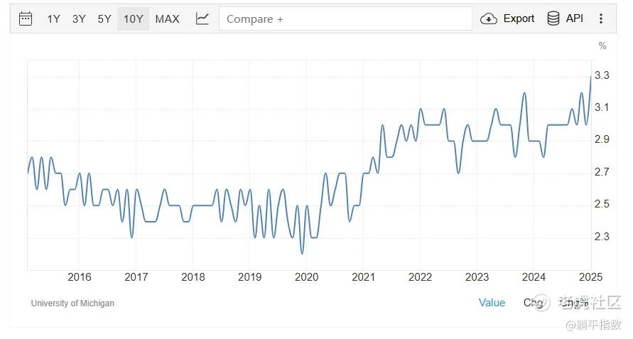 一个非常显而易见的道理是,如果消费者预期未来通胀上升,那么就会让消费提前发生,也就是所谓的“买涨不买跌”。密歇根大学统计的美国消费者5年通胀预期在最近上升至十年新高,甚至高于2022年那段通胀急速攀升的时期,这对于通胀来说绝对不是好消息。