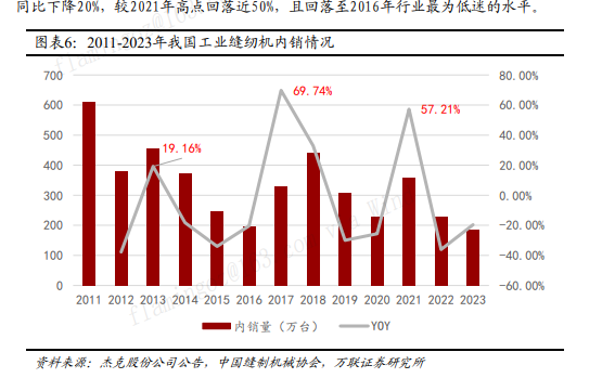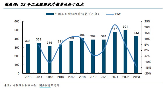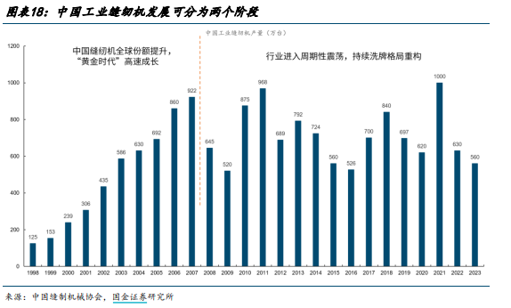 整个制衣工业的重心向东南亚迁移,自然,也带动中国缝纫机行业转为为了出口导向。而全球缝纫机也不是什么好市场,主要大家衣服需求也就那样了,没有什么大增速,所以放到全球看也是一个周期性的行业,在设备更换周期景气一下,总体增速也堪忧。从08年以后,缝纫机行业产量就没怎么高过,外销增长一直在抵消内需减少。