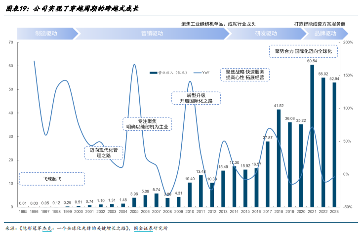 从公司的成长轨迹出发,杰克股份发展轨迹跟中国纺织业全球化的发展紧密相连,虽然缝纫机在中国已有百年历史,但杰克股份公司加入这个行业也只是从1995年开始,是一家年轻的缝纫机公司,2001年,中国加入世贸,中国的纺织行业也逐渐走向巅峰。