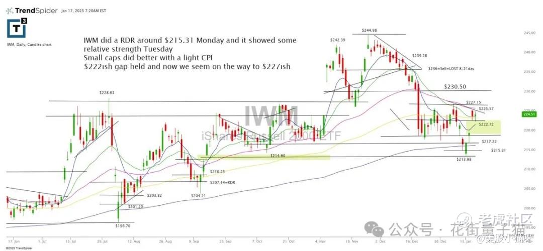 IWM在周一围绕215.31美元的枢轴进行RDR,并在周二表现出一些相对强势。小盘股在较轻的CPI影响下表现更好。222美元附近的缺口得以维持,现在似乎正朝着227美元迈进。