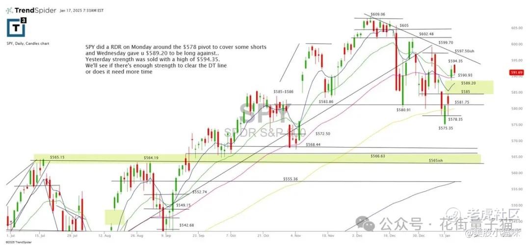 SPY在周一围绕578美元的枢轴进行了RDR,覆盖了一些空头,周三给出589.20美元作为做多的支撑。昨日强势被抛售,达到594.35美元的高点。接下来我们将观察是否有足够的动能突破下降趋势线,或者是否需要更多时间。