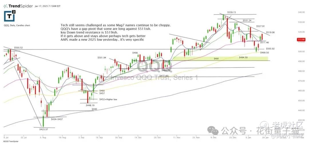 科技板块仍然面临挑战,一些Mag7股票继续呈现震荡状态。QQQ存在一个缺口枢轴,一些投资者在511美元左右布局。主要的下降趋势阻力位在511美元附近。如果突破并稳定在上方,科技板块可能会有所改善。昨日,AAPL创下2025年新低,这是一个非常明确的信号。