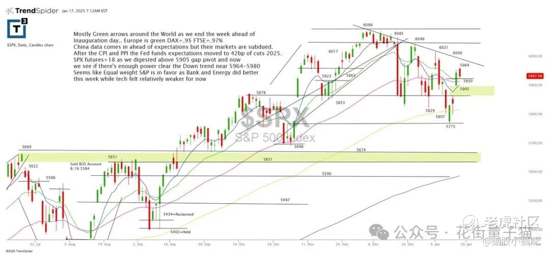 世界各地几乎呈现绿色箭头,随着总统就职日的临近,我们结束了这一周。欧洲市场上涨,DAX上涨0.95%,FTSE上涨0.97%。中国数据优于预期,但其市场表现平淡。在CPI和PPI公布后,美联储基金预期下调2025年42个基点。SPX期货上涨18点,我们已经消化了5905缺口枢轴,现在来看是否有足够的动能突破5964-5980附近的下行趋势。目前看来,等权重的标普500受到青睐,因为银行和能源板块表现较好,而科技板块暂时表现较弱。
