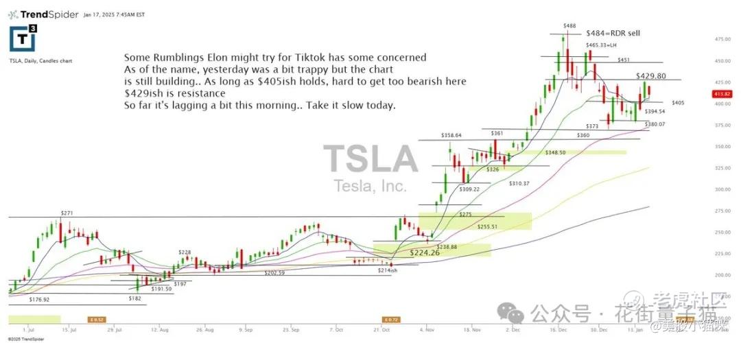 有传言称埃隆·马斯克可能会尝试收购TikTok,这引发了一些担忧。就特斯拉而言,昨天的走势有些陷阱式,但整体趋势仍在构建中。只要405美元附近的支撑保持,较难看空,429美元左右是阻力位。到目前为止,今天早盘走势稍显滞后。请保持谨慎。
