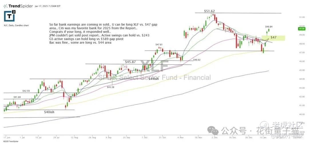 迄今为止,银行收益表现良好。可以在47美元缺口区域持有XLF多头。花旗是我2025年最看好的银行,它的表现符合预期。如果您持有多头,恭喜您。摩根大通在报告后未能完成抛售。活跃波段可在243美元附近持有。高盛的活跃波段可在589美元缺口枢轴处持有多头。美国银行表现良好,一些人以44美元为支撑布局多头。