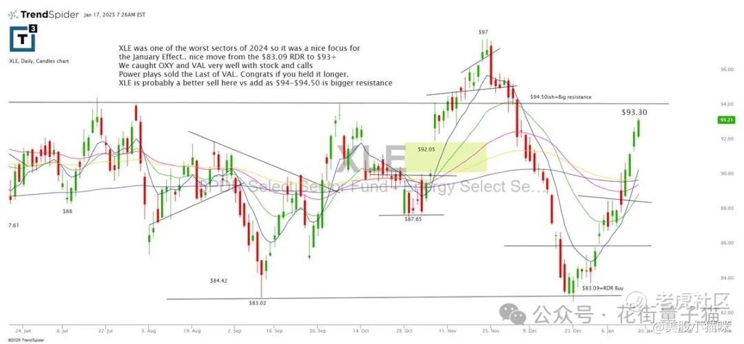 XLE是2024年最差的板块之一,因此在1月效应中成为一个不错的关注点。从83.09美元的RDR到93美元以上的走势非常出色。我们成功抓住了OXY和VAL的股票和期权交易。强势操作在VAL上完成了最后一波抛售。如果您持有更久,恭喜您。相比于增加仓位,XLE在94-94.50美元更适合作为卖出点,因为该区域是一个较大的阻力位。