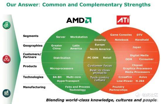 2006年,AMD收购了ATI,这为AMD的GPU(图形处理单元)技术奠定了基础。ATI是一家专注于显卡技术的公司,收购后,AMD不仅增强了在GPU市场的地位,也能够提供全面的图形解决方案,形成了与英伟达直接竞争的能力。