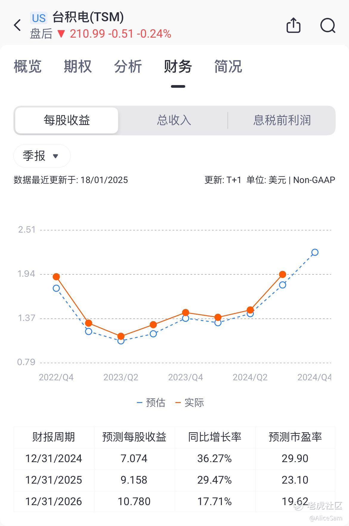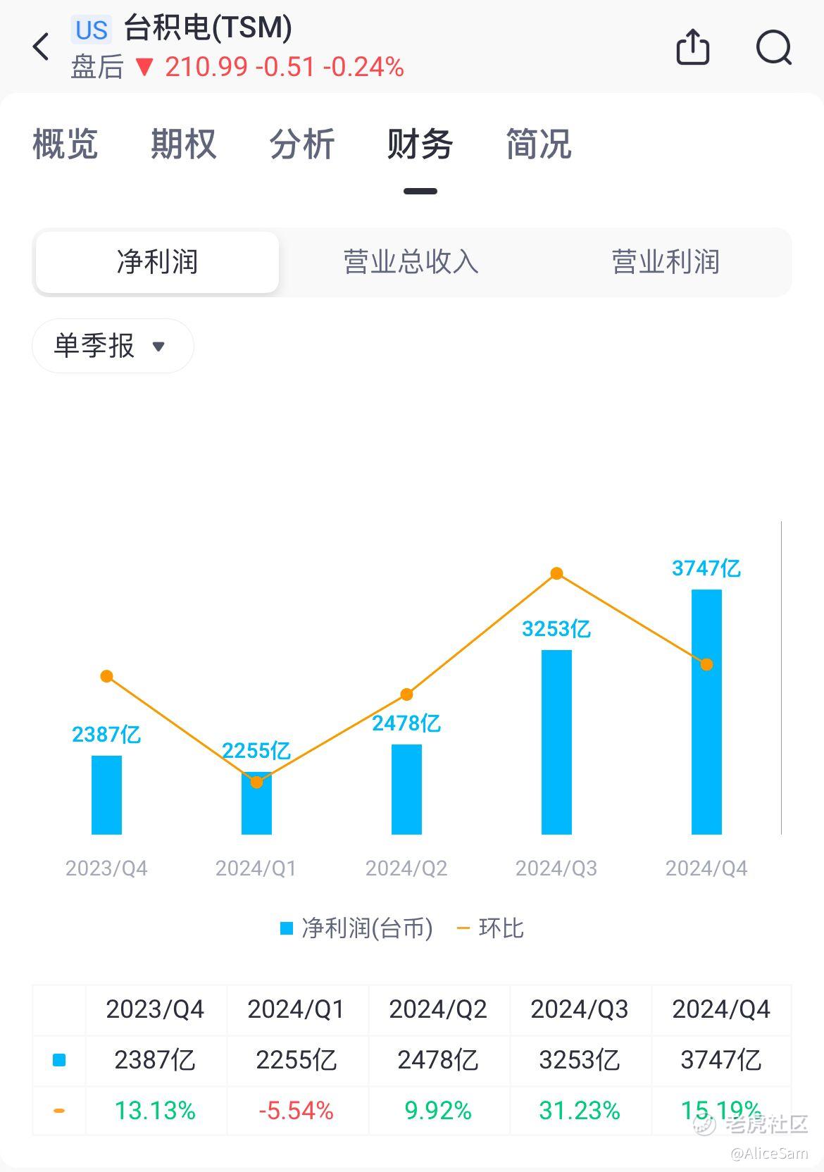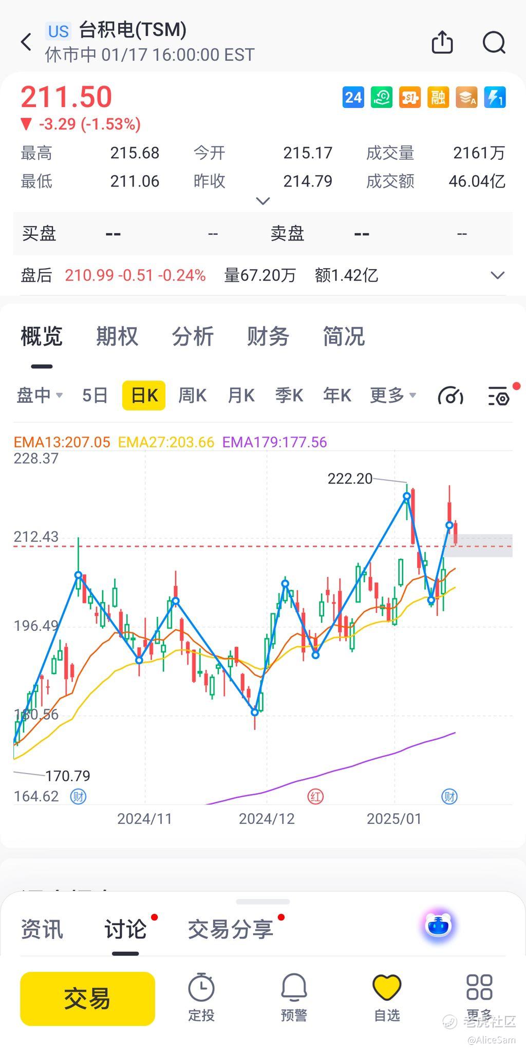 市场对这份成绩好像并没有特别大的热情,财报出来后,台积电的股票没有大涨。目前的股价211多,不上不下的,抄底嫌不够低,追高嫌没有冲劲,观望一下先吧。