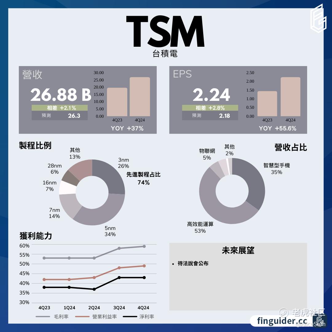 最后看看他们的展望,在所有 AI 创新者均已与台积电建立合作关系的情况下,台积电将通过与客户更密切的沟通来合理规划产能,并严格保持资本支出纪律。预估 2025 年第一季度营收为 250~258 亿美元,季减-5.5%、年增 34.7%,毛利率落在 57%~59%,皆优于市场预期。另外预测 2025 全年营收预计将成长约 25%。