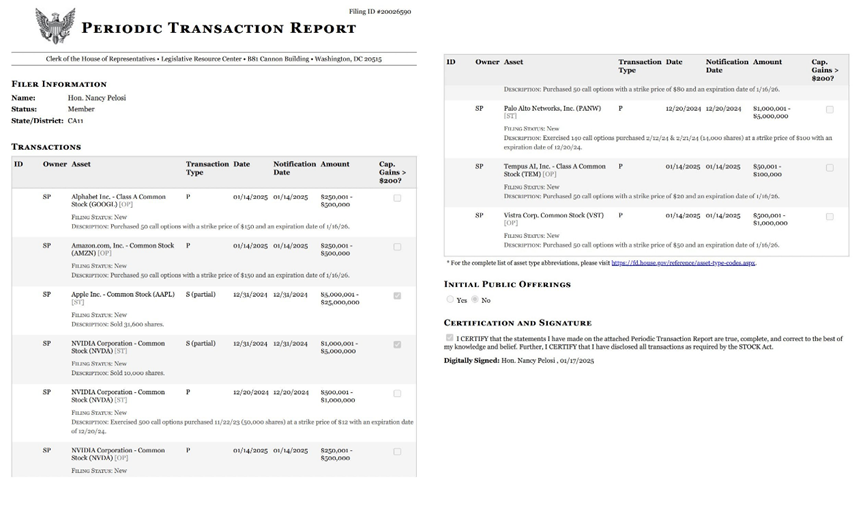 美股周一没有开盘,那不如先来看下佩洛西的最新操作吧,(这些交易都是在就职日前操作的),买入了大量的看涨期权: $谷歌(GOOG)$ 、 $亚马逊(AMZN)$ 、 $英伟达(NVDA)$ 、 $Palo Alto Networks(PANW)$ 、 $Tempus AI(TEM)$ 、 $Vistra Energy Corp.(VST)$ ,卖了 $苹果(AAPL)$ 和英伟达的股票。佩洛西把英伟达正股换成了看涨期权,另外 $Tempus AI(TEM)$ 是一个24年上市的公司,“木头姐”也买了