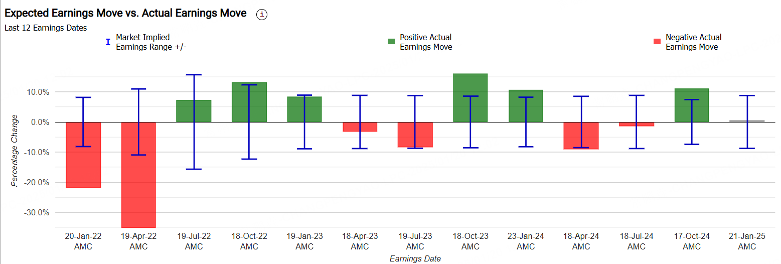 当前,奈飞的隐含变动为±8.8%,表明期权市场押注其绩后单日涨跌幅达8.8%;财报发布后的预期波动幅度平均为 ±9.6%,而实际财报波动幅度的平均值为 12.2%(绝对值)。这表明,NFLX 的财报股价波动通常比期权市场的预期更加剧烈。