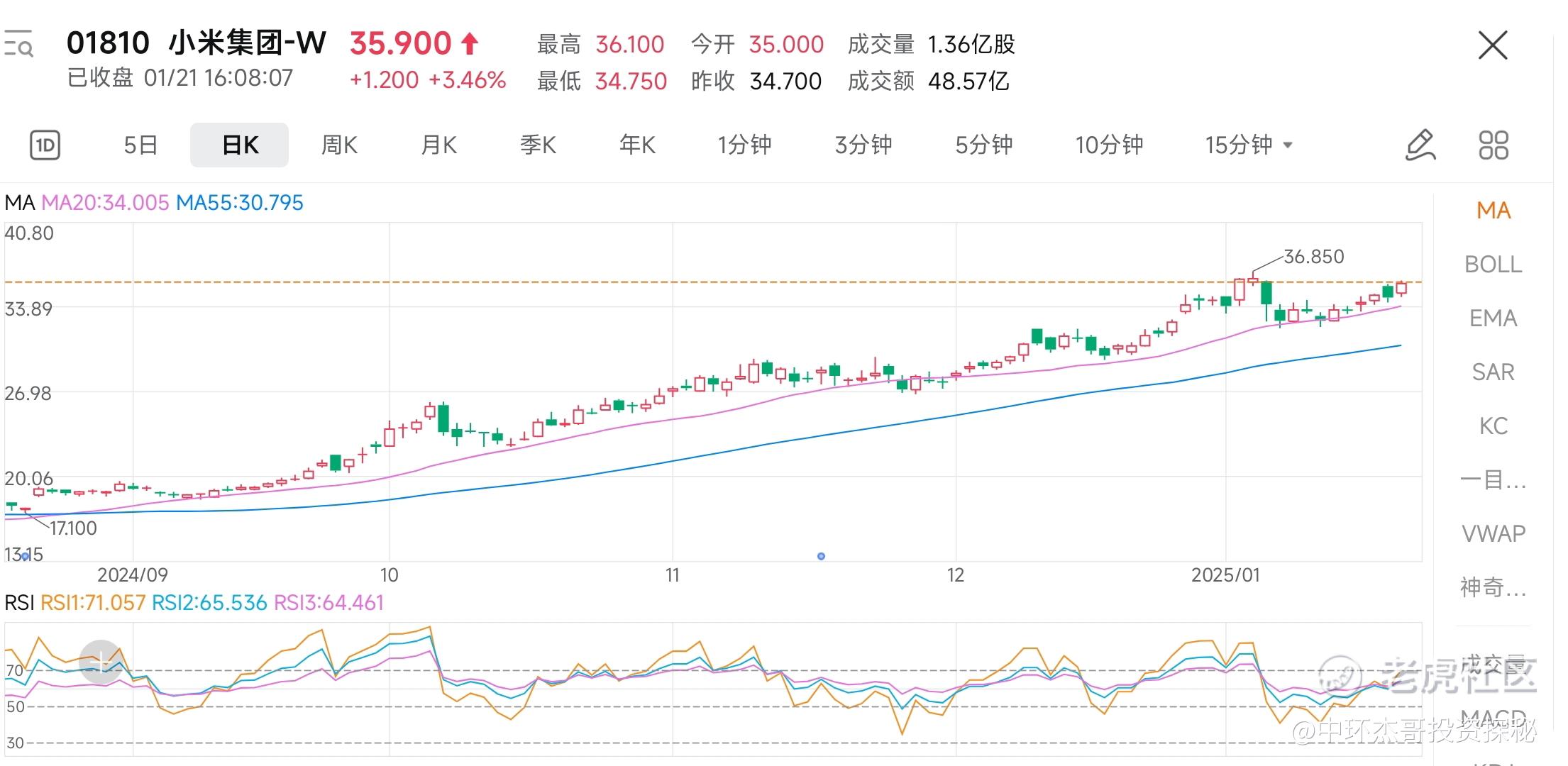 正如昨天所说,日线和周线级别,短期无忧,小米,个股基本面极好,而且政策暖风频吹,而大环境的现状是,虽然还没有大的转变,但是,短期反而没有问题,连美国也要等上2-3个月才会有真正对中政策。所以,小米还可以按照趋势,慢慢走,直到逆转信号的发生。