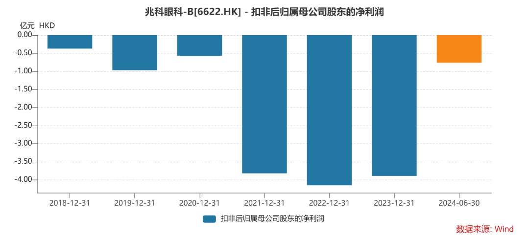 只是公司依旧处于亏损状态,2024年上半年亏损7580万元,不过相比过去两年表现已经好转了很多,同比收窄 67.58%,兆科眼科上市后商业化进程一直不及预期,没有收入的同时还需要持续投入研发,导致股价持续下跌。