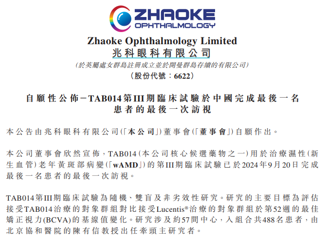 2024 年 9 月 20 日,TAB014 用于治疗湿性(新生血管)老年黄斑部病变(“wAMD”)的第 III 期临床试验完成最后一名患者的最后一次访视,这为后续新药上市申请吹响了号角。