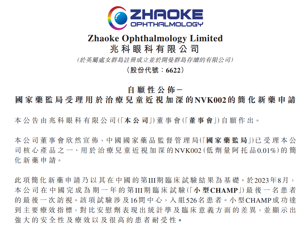 不久前,兆科眼科(06622.HK)发布公告称,国家药品监督管理局已受理公司核心产品之一、用于治疗儿童近视加深的NVK002(低剂量阿托品0.01%)的简化新药申请。