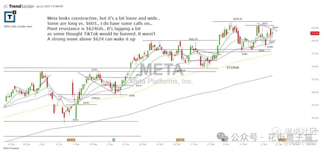 Meta 看起来具有建设性,但走势稍显宽松且波动较大。一些人持有 $603 的多头头寸,同时我也有一些看涨期权。枢轴阻力位在 $624 附近。一些人曾认为 TikTok 会被禁用,但事实并非如此。若能突破 $624 的强阻力位,可能会带来进一步上涨。