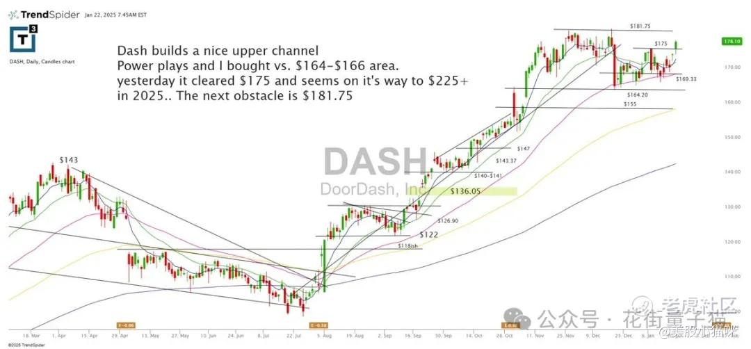 DASH在上升通道中表现出色,我在164至166美元区域进行了加仓操作。昨日突破175美元,似乎有望在2025年达到225美元以上。目前的下一个阻力位是181.75美元。