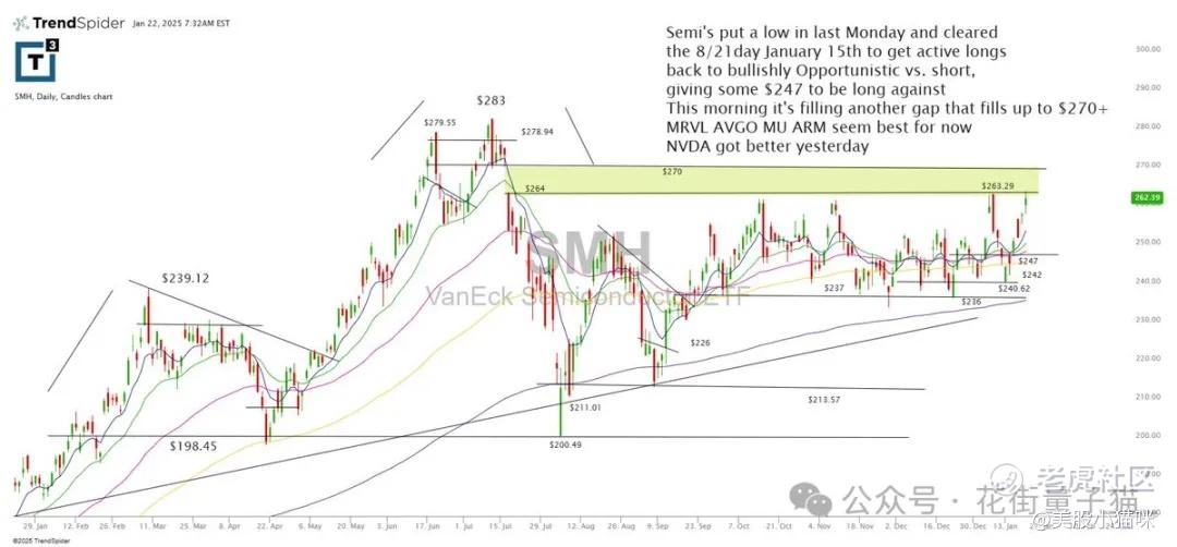 半导体指数(SMH)在上周一创出低点后反弹,清除了 8/21 日均线。1 月 15 日以来的走势重回多头模式,目标位在 $270+。目前推荐关注 MRVL、AVGO、MU、ARM,昨日 NVIDIA 表现改善。