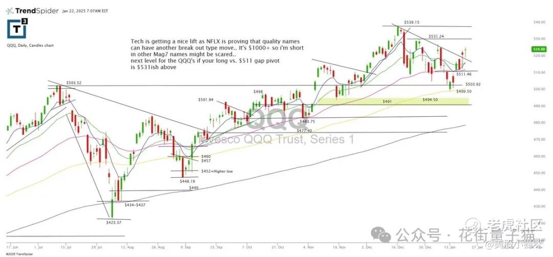 科技股在 Netflix 的带动下上涨,QQQ 的下一目标价位在 $531 附近。若能突破 $511 的缺口枢轴点,可能进一步上行。