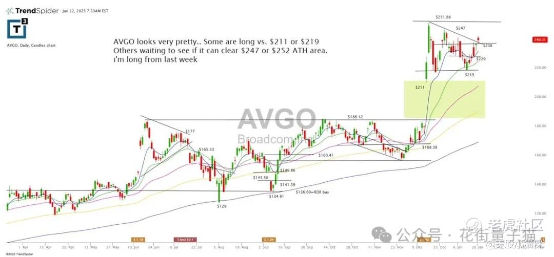 Broadcom 表现良好。一些人持有 $211 或 $219 的多头头寸,其他人则在观望,等待是否能够突破 $247 或 $252 的历史高点。我上周已经建立了多头头寸。