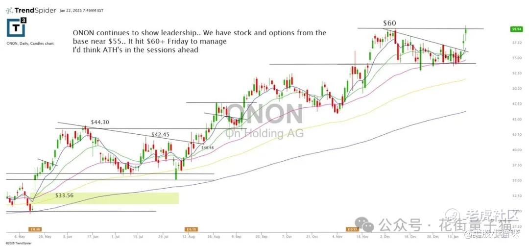 ONON继续展示领导力。我们在55美元附近的底部持有股票和期权。上周五突破60美元,我认为接下来可能会创下历史新高。