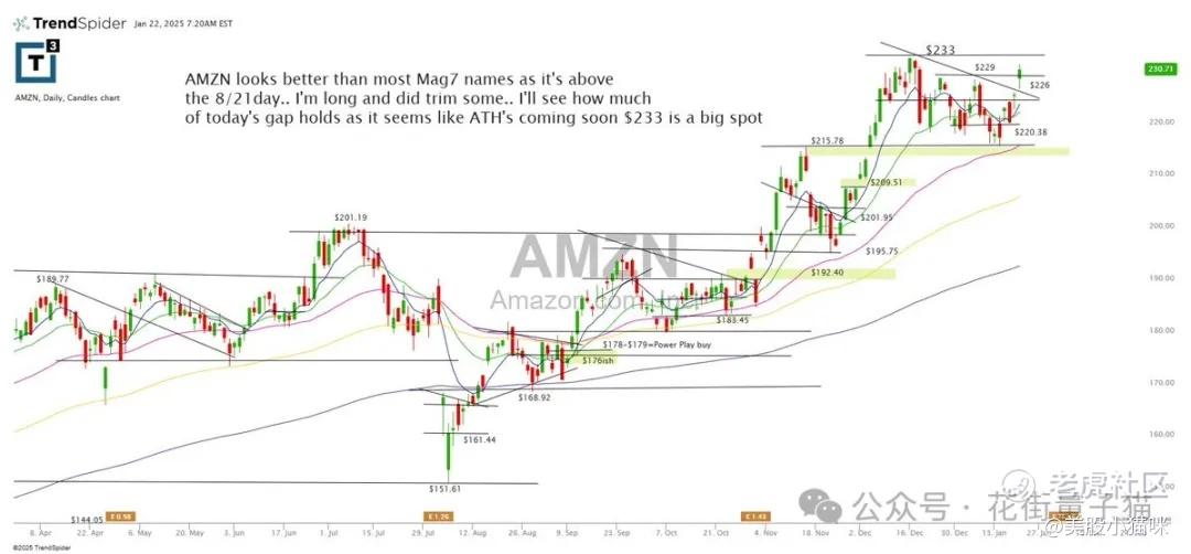 亚马逊表现优于其他 Mag7 股,目前高于 8/21 日均线。若能维持当前涨幅,目标价为 $233。
