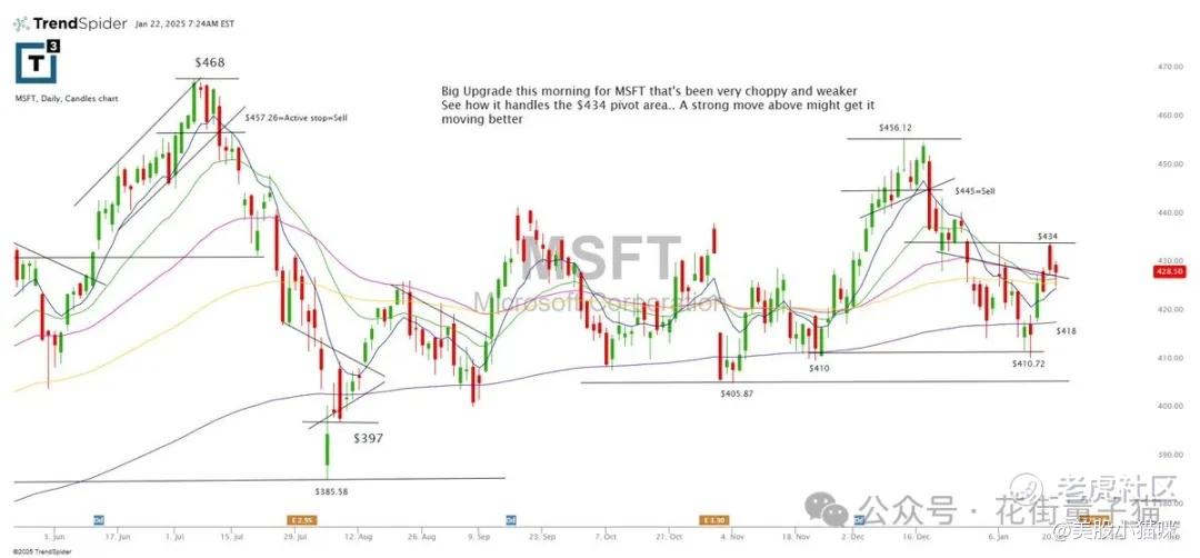 微软(MSFT)近期走势震荡偏弱。今日获得大幅升级,关注 $434 的枢轴区域。若能突破该位置,可能改善走势。