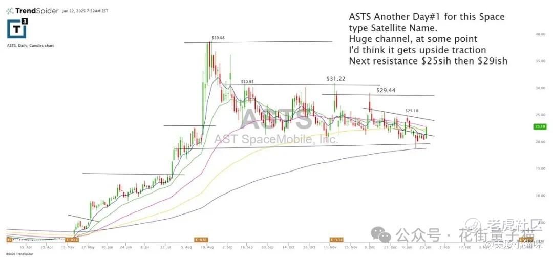 ASTS 表现稳定。这是一只太空卫星类型的股票,目前处于宽幅通道中。下一阻力位在 $25 附近,若突破则可能测试 $29。