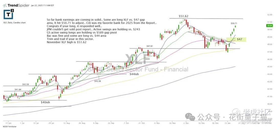 银行板块业绩稳健。部分投资者在 $47 缺口买入 XLF,当前已突破 $50.71。Citi 是 2025 年的首选银行股,建议分步减仓并跟踪止损。