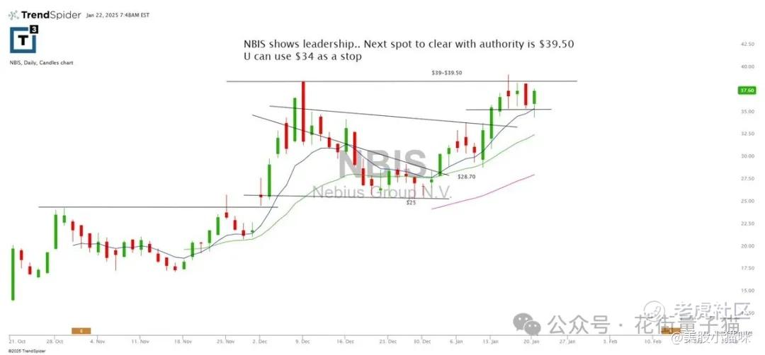 NBIS展现出领导力。下一个需要突破的关键点是39.50美元,建议将34美元作为止损点。