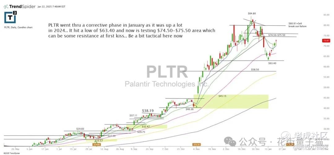 PLTR在2024年大幅上涨后,1月经历了修正阶段。它最低达到了63.40美元,目前正在测试74.50-75.50美元区域,这可能在初次接触时形成一定阻力。此时需要更加策略性地进行操作。