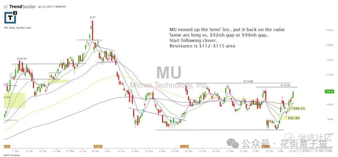 MU重新进入半导体关注名单,目前一些投资者持有92美元或99美元缺口的多头仓位。需密切关注,阻力位在112至115美元区域。