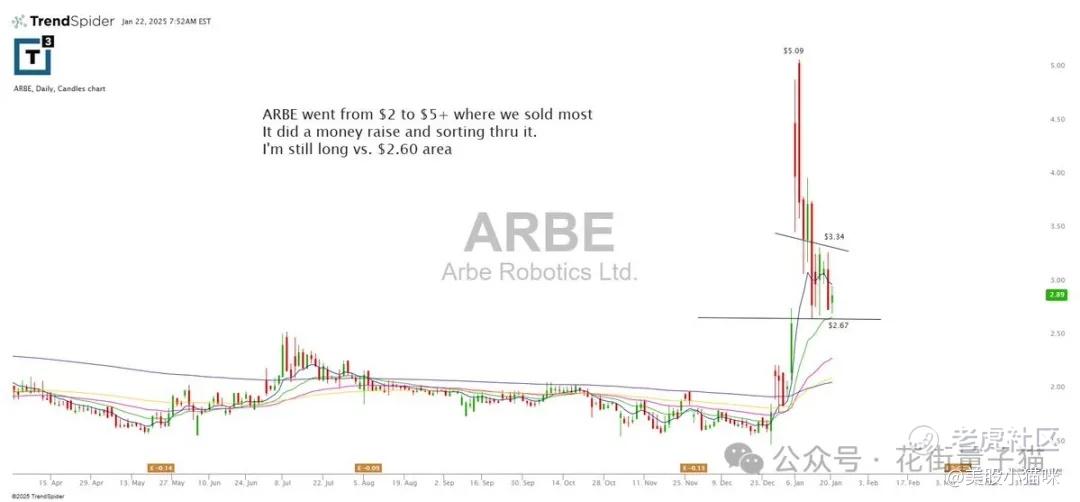 ARBE 股价从 $2 涨至超过 $5,我们已卖出大部分头寸。公司进行了融资,目前仍在整理中。我仍然持有 $2.60 区域的多头头寸。
