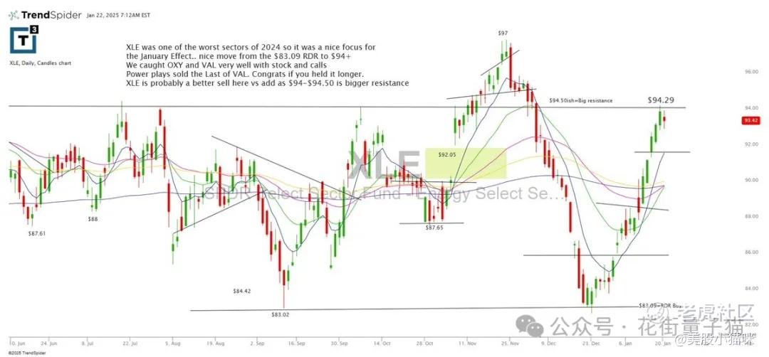 能源板块 XLE 表现亮眼,从 $83.09 的 RDR 涨至 $94+,但 $94-$94.50 是更大的阻力位,建议投资者考虑减仓。
