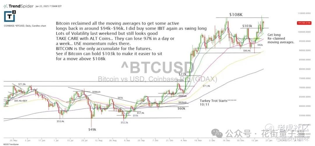 比特币重新收复了所有均线,在 $94k-$96k 区域建立了多头头寸。我再次买入 IBIT 作为波段多头头寸。比特币是唯一值得期货投资的品种,需关注是否能守住 $103k,并为突破 $108k 做准备。